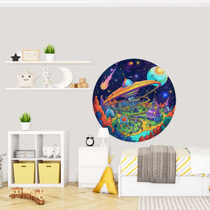 Wyobraź sobie paletę barw, która zdaje się być zaczerpnięta prosto z najbardziej kreatywnych marzeń. Okrągła Fototapeta Kosmiczne Metropolis mieni się odcieniami fioletu, pomarańczu, zieleni i błękitu, które harmonijnie łączą się, tworząc obraz pełen życia i energii. W centrum tej wizji znajduje się imponująca, futurystyczna konstrukcja przypominająca kosmiczny port, otoczona zielonymi alejkami i bajkowymi budynkami. Każdy fragment tego dzieła to zaproszenie do podróży w nieznane – miejsca, gdzie technologia i natura współistnieją w idealnej harmonii.