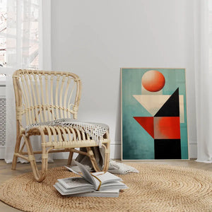 Kolorystyka plakatu emanuje spokojem, a jednocześnie żywiołowością. Odcienie nawiązuje do głębi morskich głębin, gdzie każdy element gra z innym, tworząc unikalną symfonię wizualną. Pomarańczowy okrąg jest jak zachodzące słońce, a trójkąty i kwadraty tańczą na niebie, budując przestrzeń pełną emocji. Plakat Geometryczna Harmonia to prawdziwa uczta dla zmysłów, która zainspiruje do refleksji i twórczości.